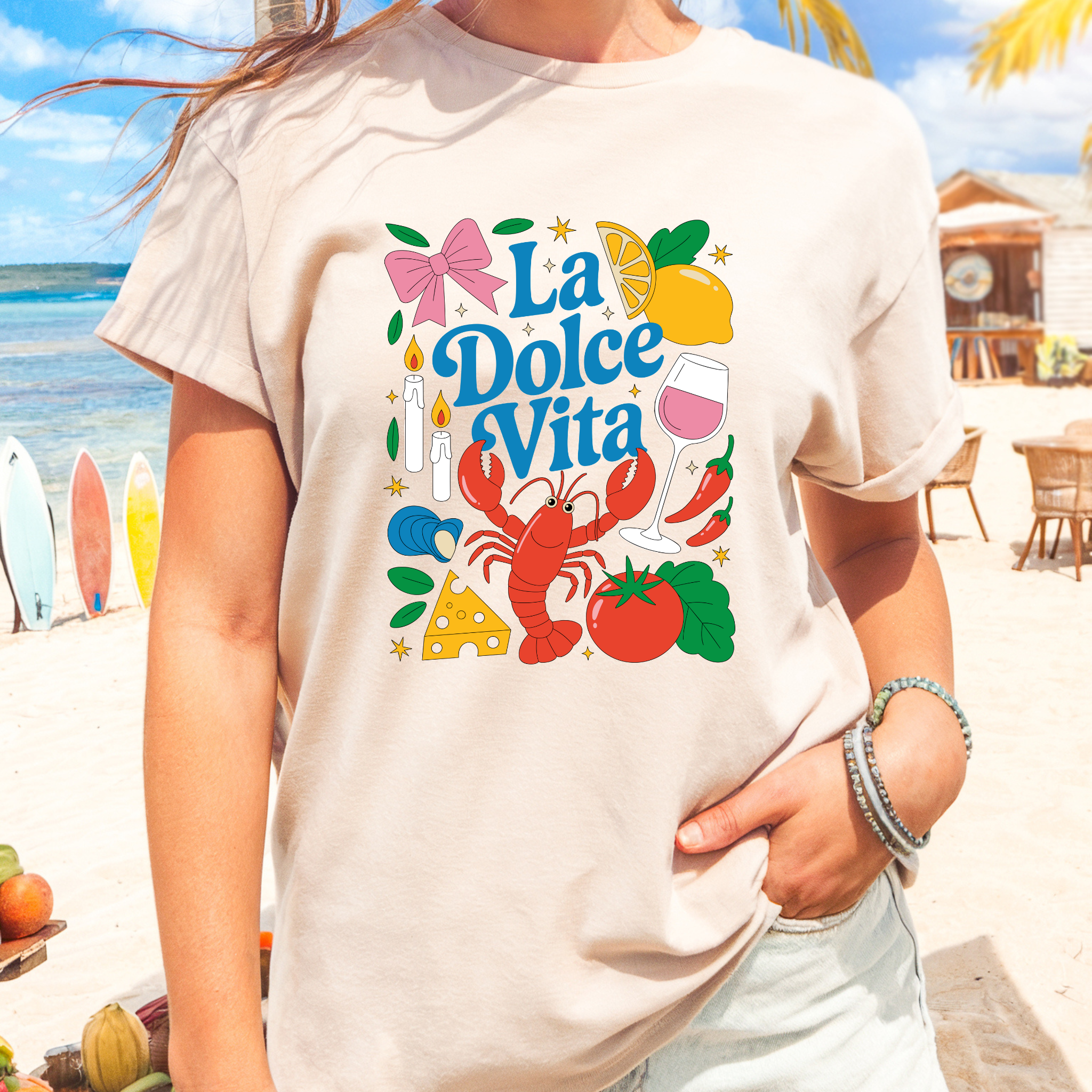 Meet your new favorite tee—a whimsical celebration of the sweet life, Italian style. The La Dolce Vita Cartoon Tee brings playful charm with its fun, illustrated design that captures the joy and leisure of living beautifully. Whether you're sipping espresso, lounging by the coast, or just embracing a slower pace of life, this tee is your daily reminder to savor the moment. Cozy, colorful, and unapologetically fun—because life's too short not to wear your philosophy on your sleeve.