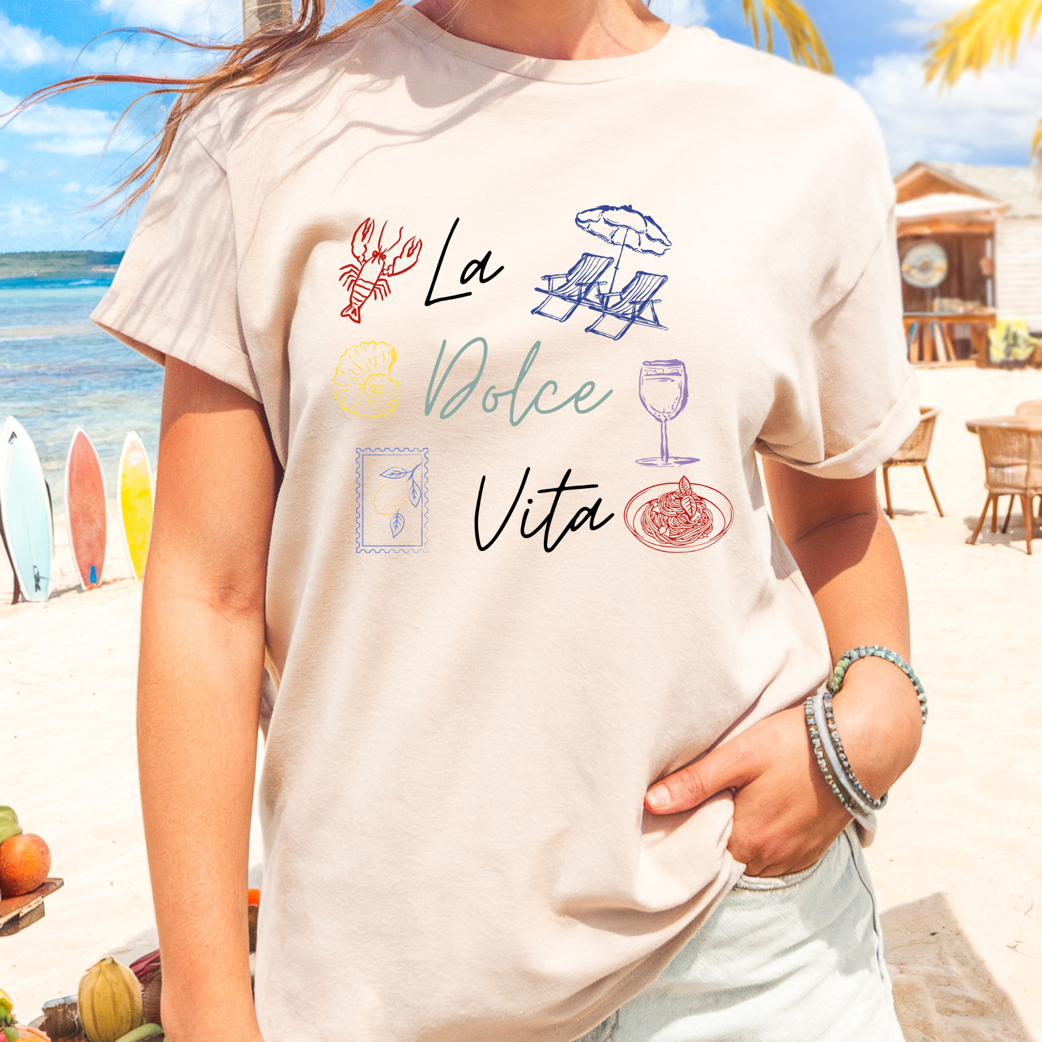 Embrace the sweet life with this charming tee that celebrates all those little moments that make living worthwhile. Inspired by the Italian philosophy of savoring joy in everyday pleasures, this shirt is your wearable reminder to slow down and appreciate the good stuff. Soft, stylish, and brimming with personality, it's perfect for anyone who believes the best things in life aren't things at all—they're experiences, laughter, and good vibes. Wear it and spread the dolce vita energy wherever you go.