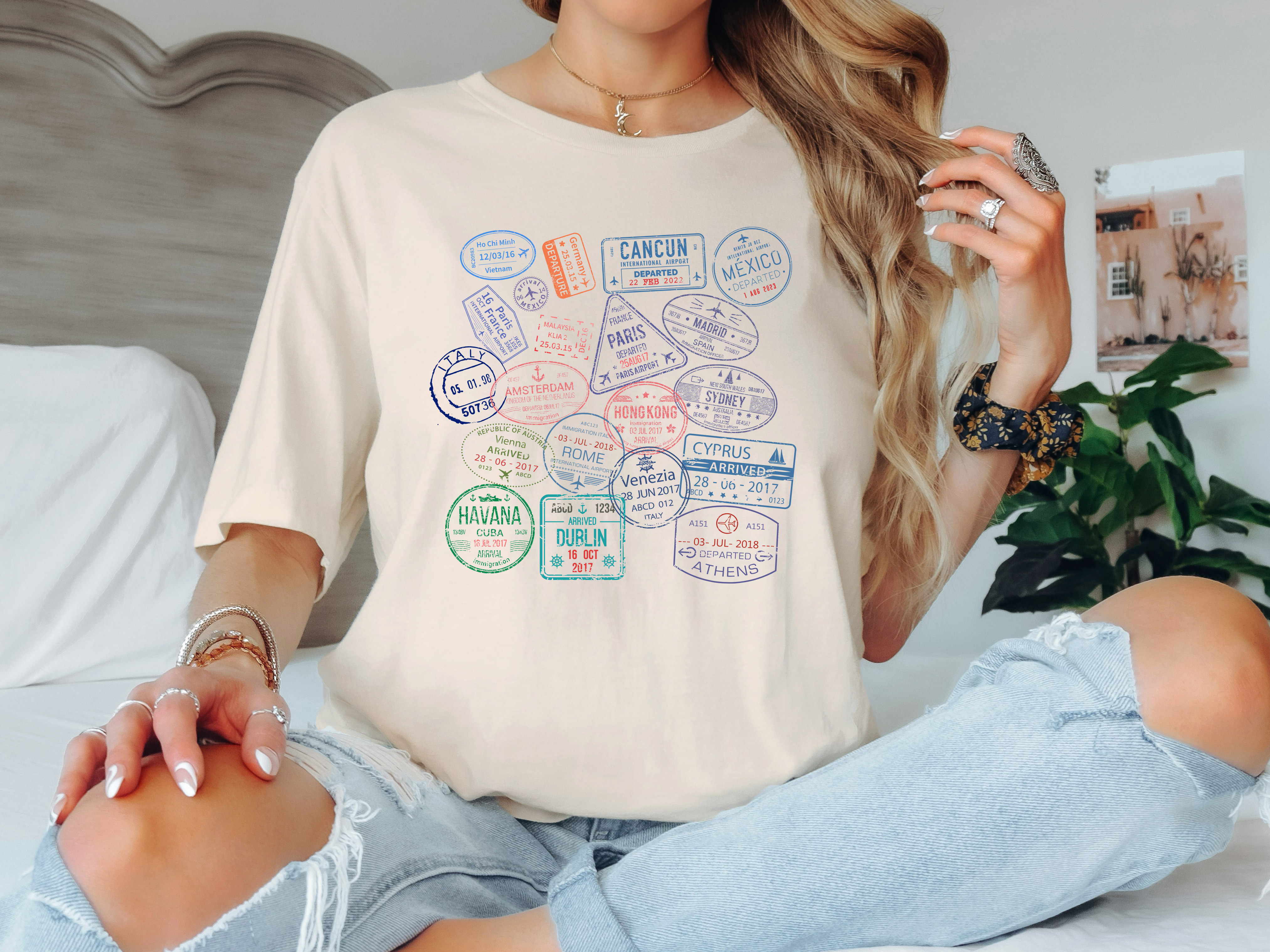 Stamp your style with the Passport Stamp Tee—a globe-trotting essential for the adventurer in you. This playful design celebrates the thrill of exploration, jet-setting dreams, and collecting memories across continents. Whether you're a seasoned traveler, armchair explorer, or someone who lives for the next big adventure, this tee speaks your language. Comfy enough for everyday wear and conversation-starting enough to turn heads. Pack it in your carry-on or wear it proud—your wanderlust deserves a uniform.
