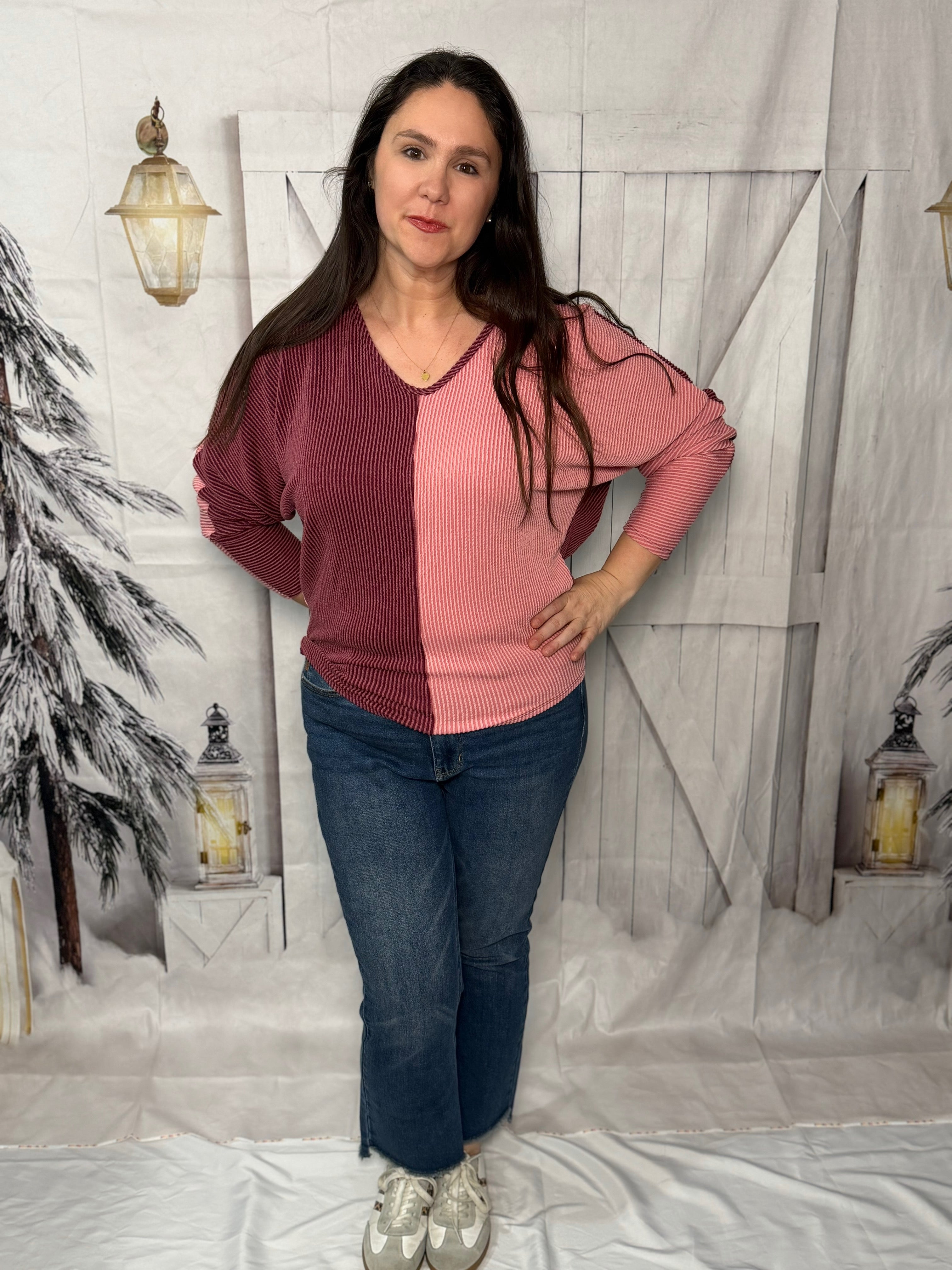 Treat yourself to the Dusky Rose Duo Top, a laid-back v-neck with subtle urban ribbing. Its long sleeves and bold color block design keep you comfy and add a fun splash of color to any outfit. (Berry-licious and trendy, this top is a playful pick for every fashion fan!)