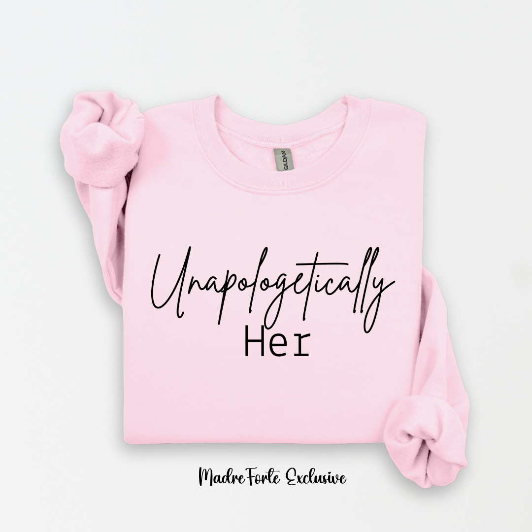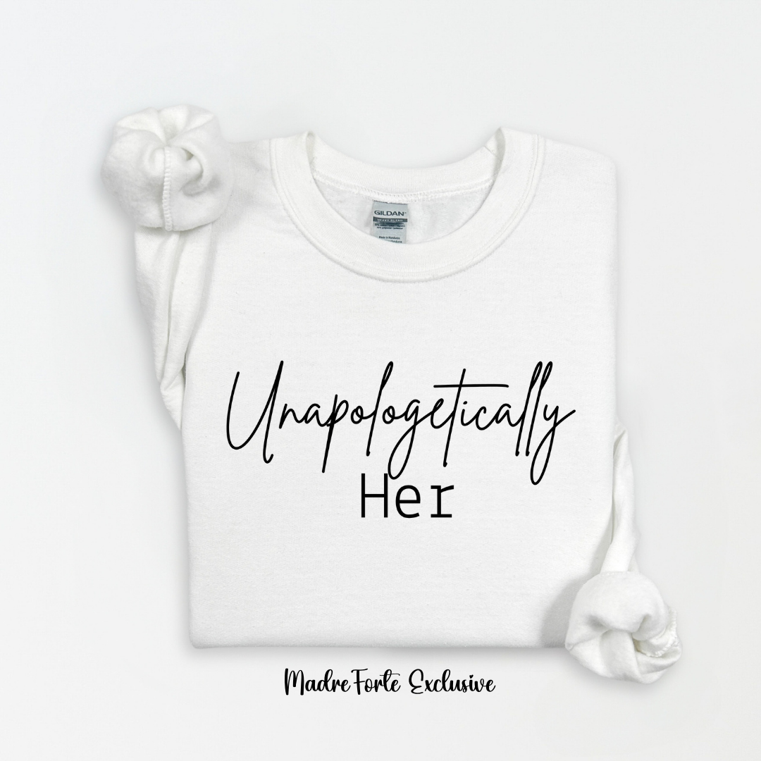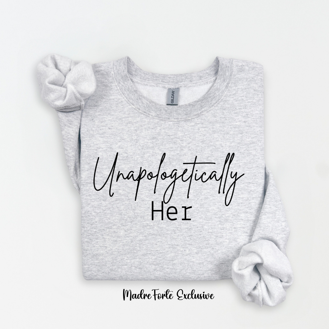 Celebrate your bold spirit with the Unapologetically Her Sweatshirt. This cozy favorite lets you wear your confidence loud and proud, blending comfort with attitude. Perfect for days when you want to feel fearless and fabulous, its playful design makes a statement without saying a word. Stay warm, stay sassy, and own your vibe every time you slip it on.