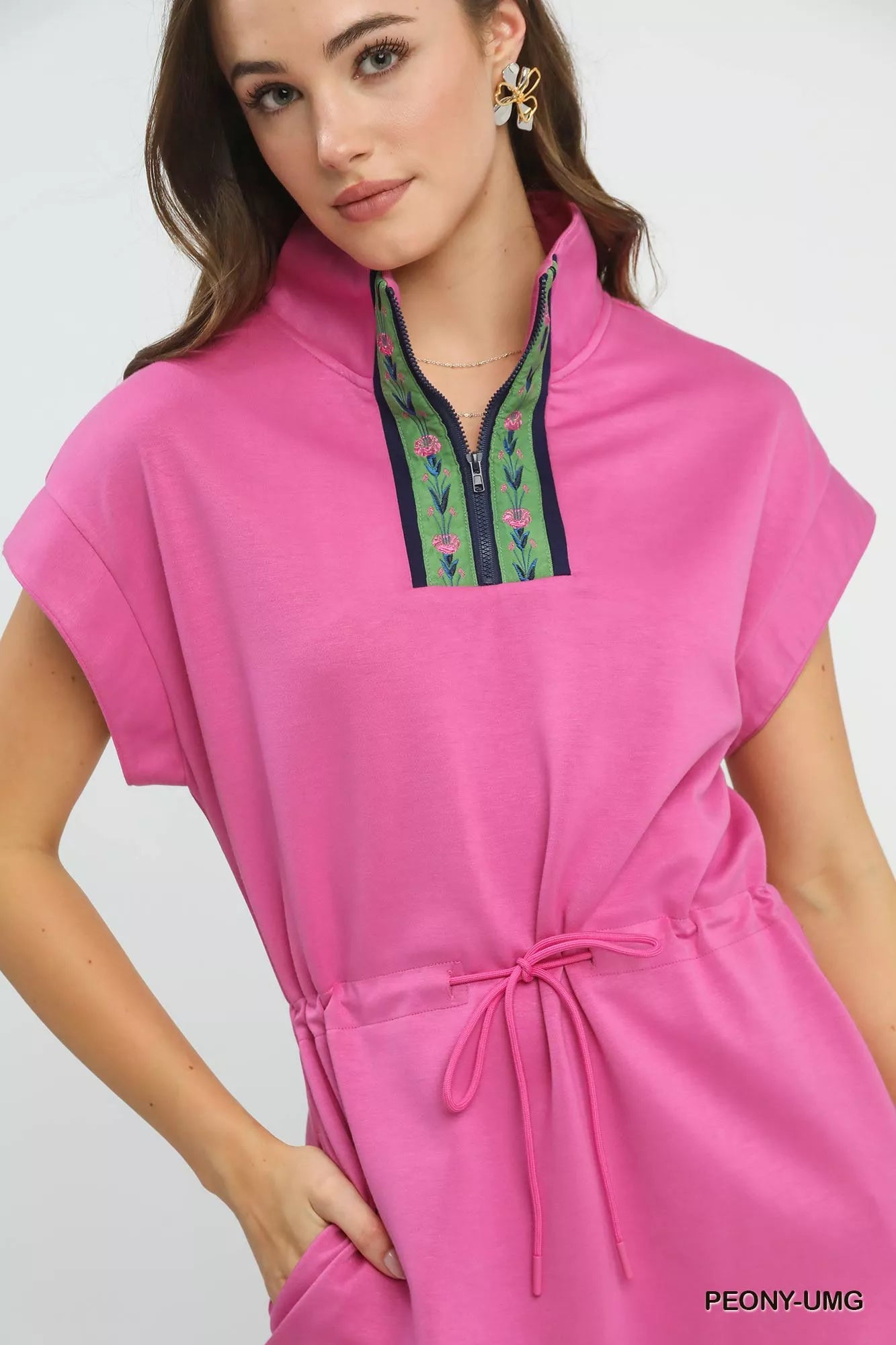 This dolman sleeve zip detail dress is made from soft and lightweight woven fabric for a comfortable fit. The dolman short sleeves add a stylish and relaxed touch to the dress. The front zip neckline with embroidered trim detail gives a modern and chic look. An adjustable waist drawstring allows for a customized fit and silhouette. Unlined for a breathable feel, this dress is perfect for a casual yet trendy outfit.