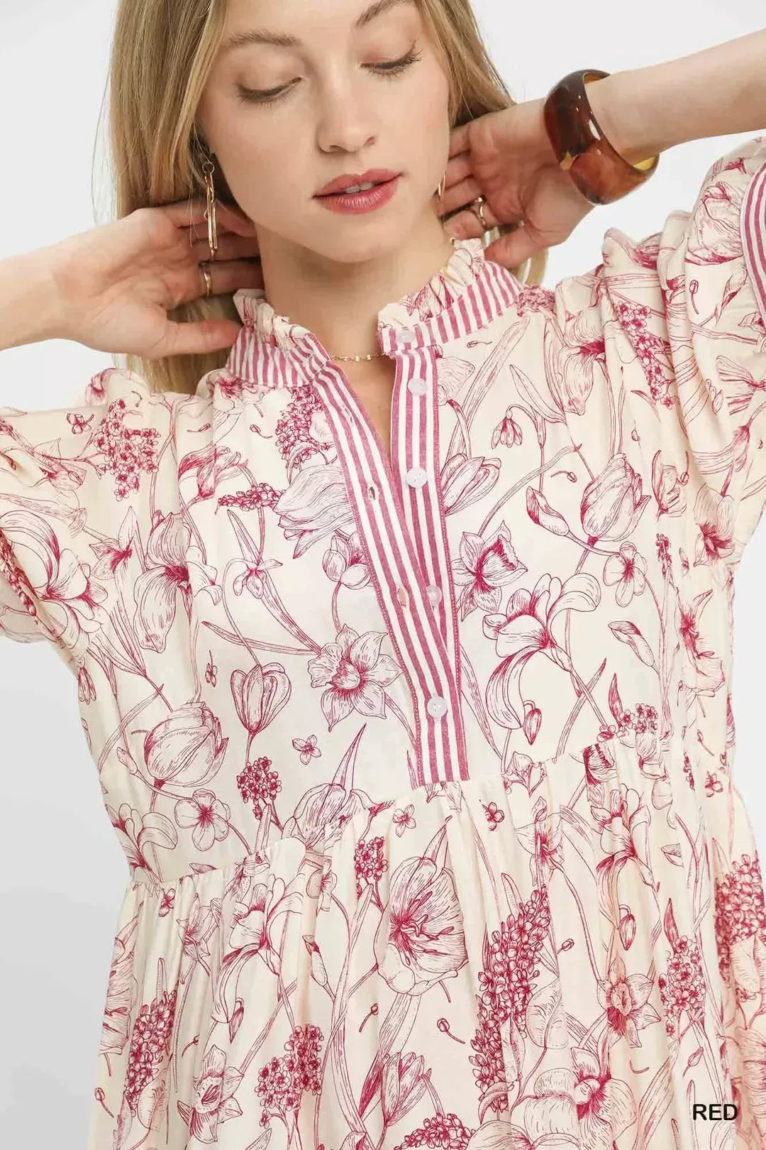 This tiered midi dress features a beautiful floral print that adds a romantic touch to any outfit. The ruffle trim detail gives it a feminine and elegant look, perfect for a special occasion or a casual day out. The midi length provides an effortless and flattering silhouette for any body shape. Pair it with your favorite sandals or heels for a stylish ensemble. This dress is a versatile piece that will become a staple in your wardrobe.