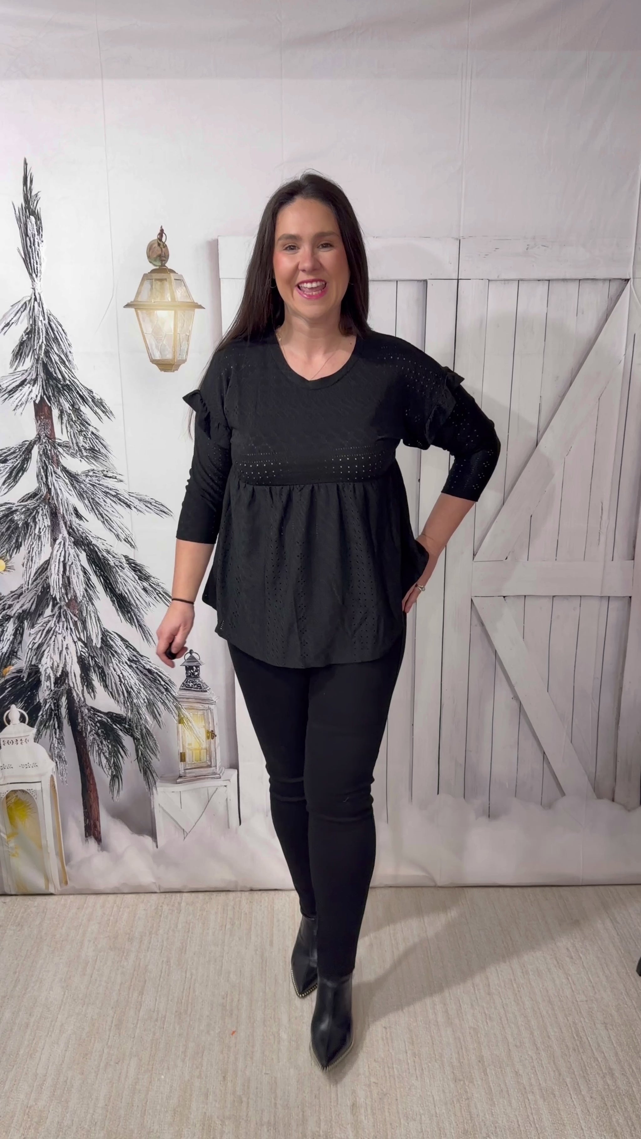 Capture everyone's attention with the After Dark Elegance Babydoll, featuring charming 3/4 length sleeves and delicate eyelet fabric. Easily pair it with any colorful piece to create a fun and unique outfit. This relaxed-fit top offers a round neckline, ruffled sleeves, and a flirty peplum hem for a playful touch.