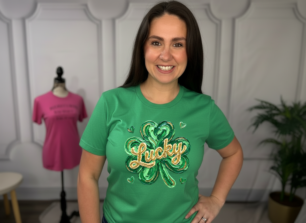 Bring a touch of golden luck to your everyday style with this playful Lucky Shamrock Tshirt. Featuring a vibrant gold-painted shamrock design, this tee celebrates good fortune with a fun, eye-catching twist. Perfect for St. Patrick's Day festivities or anyone who loves a little extra luck in their wardrobe. Soft, comfortable, and ready to spread good vibes wherever you go.