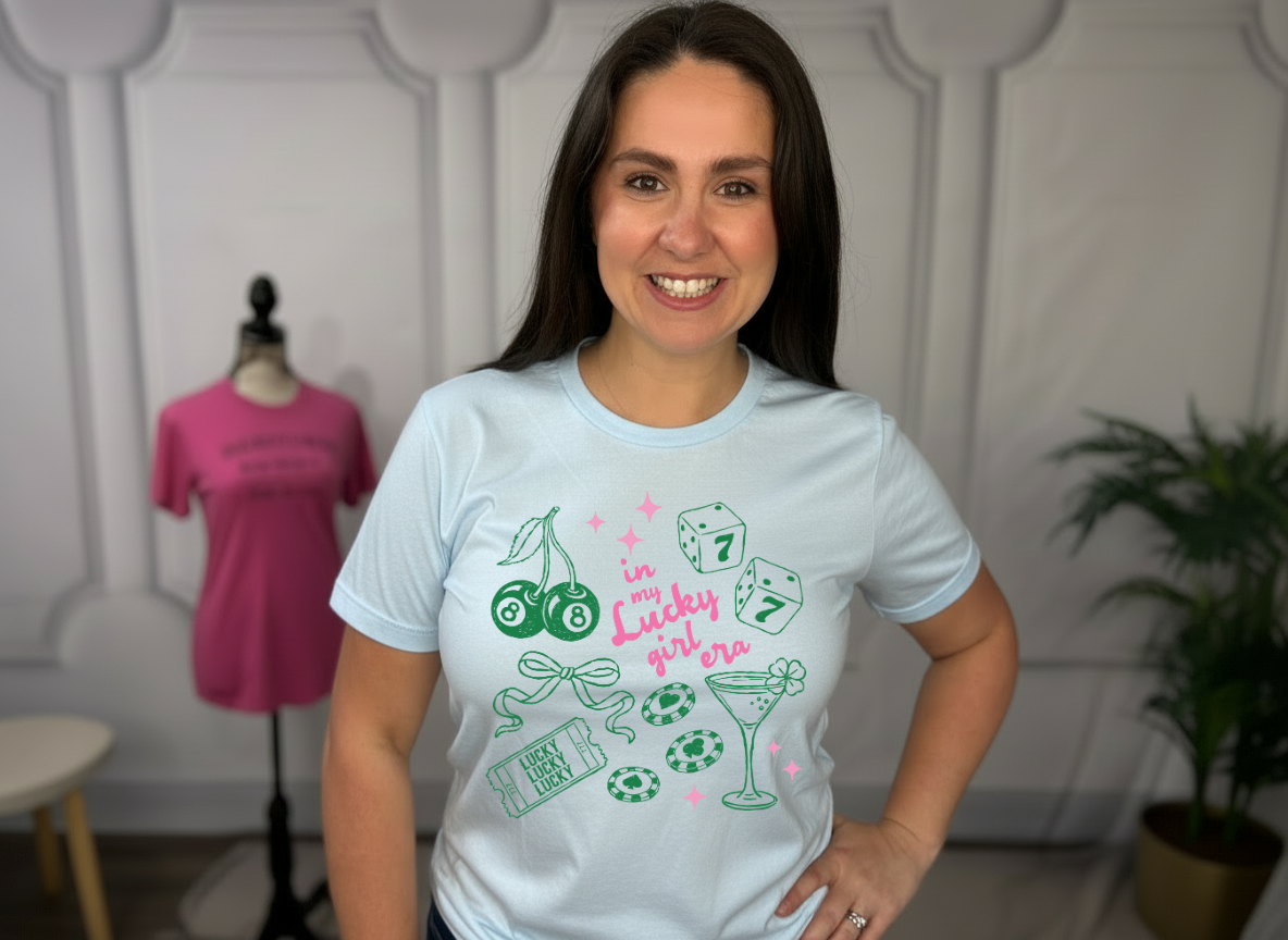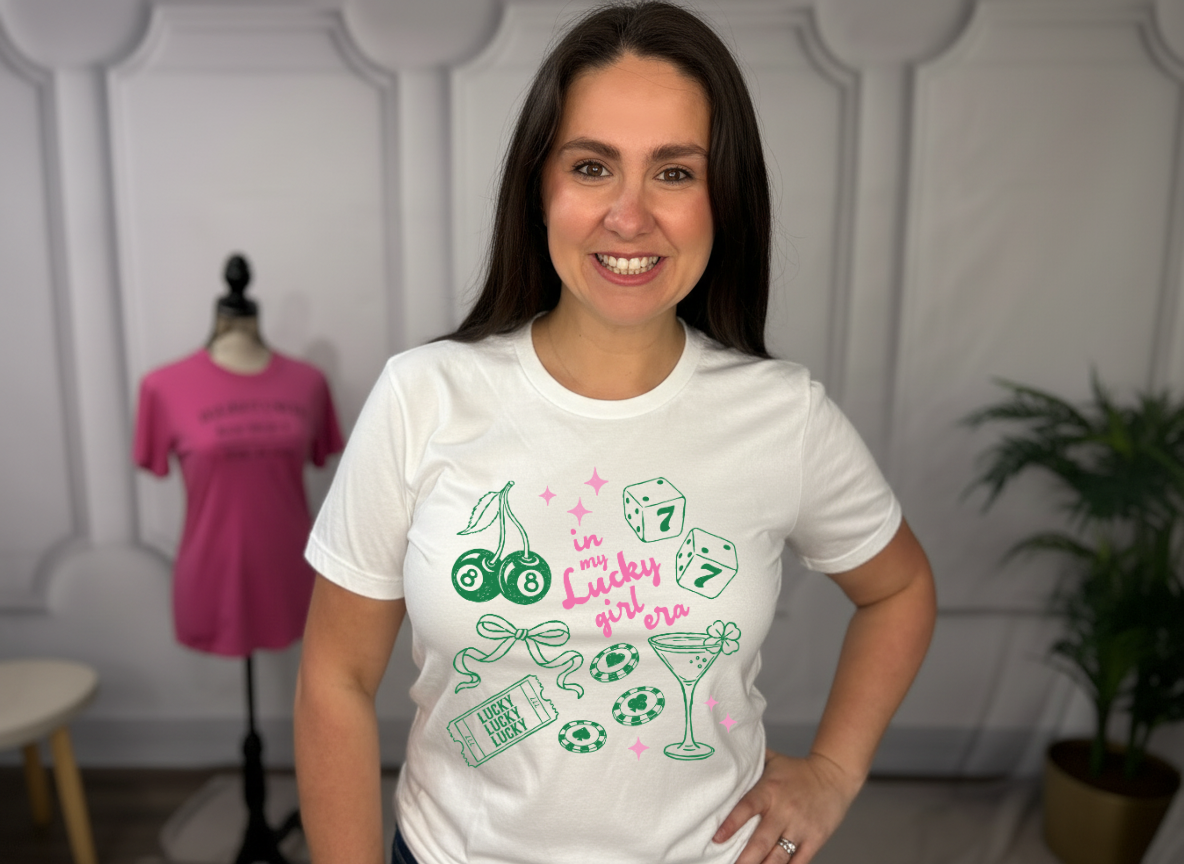 Celebrate your glow-up era with this empowering "In My Lucky Girl Era" Tshirt. Embrace the confidence, charm, and good vibes that come with knowing you're exactly where you're meant to be. This playful tee is your wearable reminder that luck favors the bold—and you're living proof. Perfect for manifesting your best self while keeping things fun and fabulous. Own your moment in style.