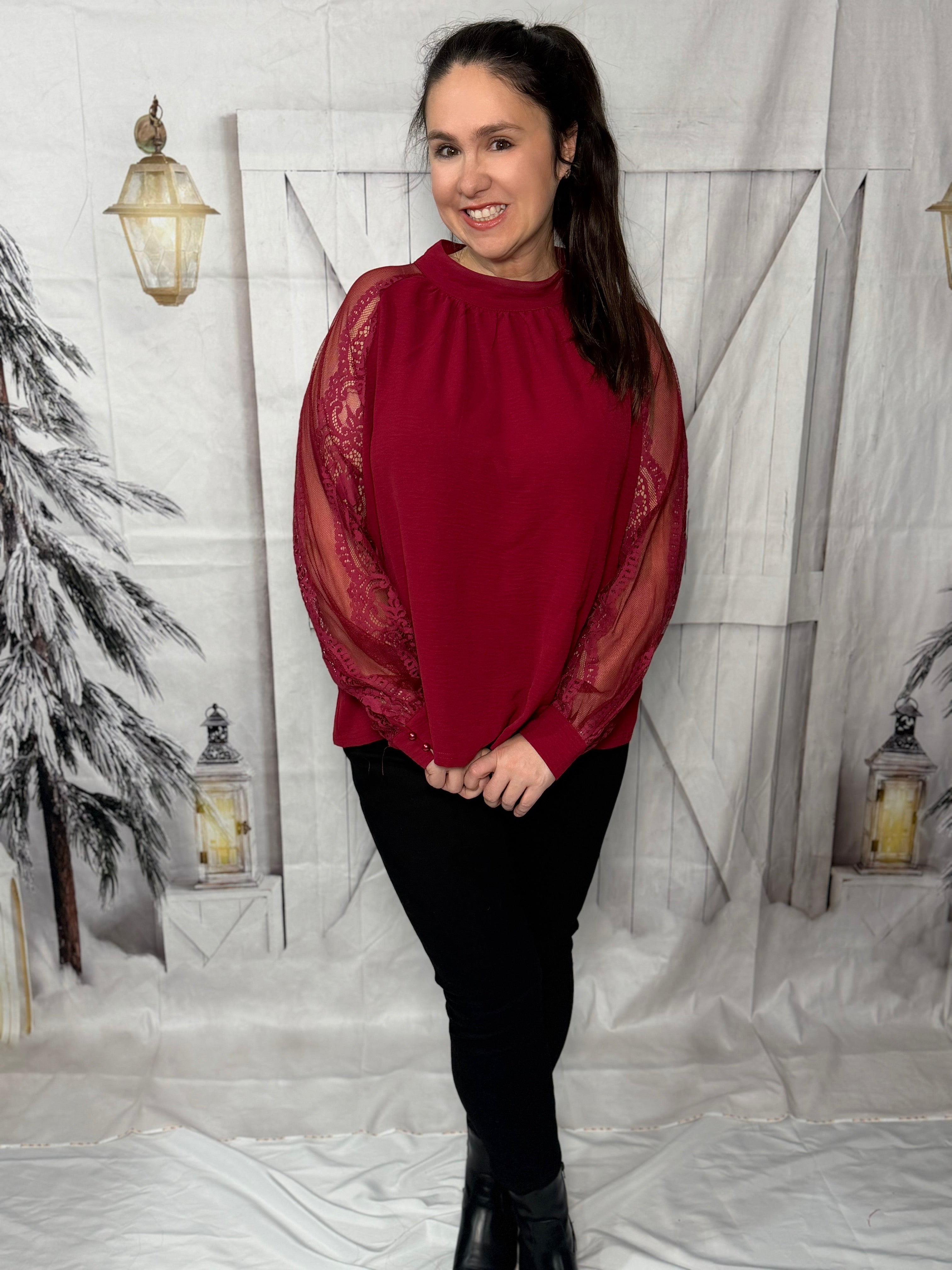 Dress to impress with the Lace on My Sleeves Blouse! Its crinkle woven bodice and lace sleeves create a stylish and modern look. Its button sleeve cuff and mock neckline add subtle yet sophisticated accents. Perfect for any occasion!