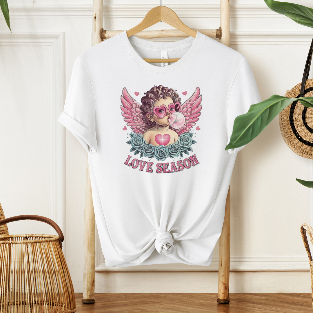 Add some love to your wardrobe with our Love Season| T-Shirt! This adorable graphic features a playful angel wearing pink sunglasses and blowing a bubble, perfect for adding some fun and personality to your outfit. Spread the love (and puns) with this quirky and stylish t-shirt.