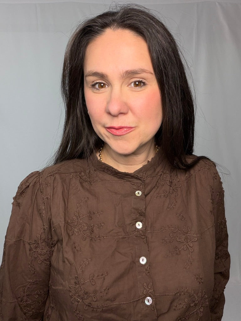 This woven long sleeve shirt features intricate 3D floral embellishments for a unique and eye-catching detail. The front button closure adds a classic and versatile touch to the design. Perfect for adding a feminine and stylish element to your outfit, this shirt can be dressed up or down. The long sleeves provide coverage and a polished look. Pair this shirt with trousers or skirts for a chic and sophisticated ensemble.
